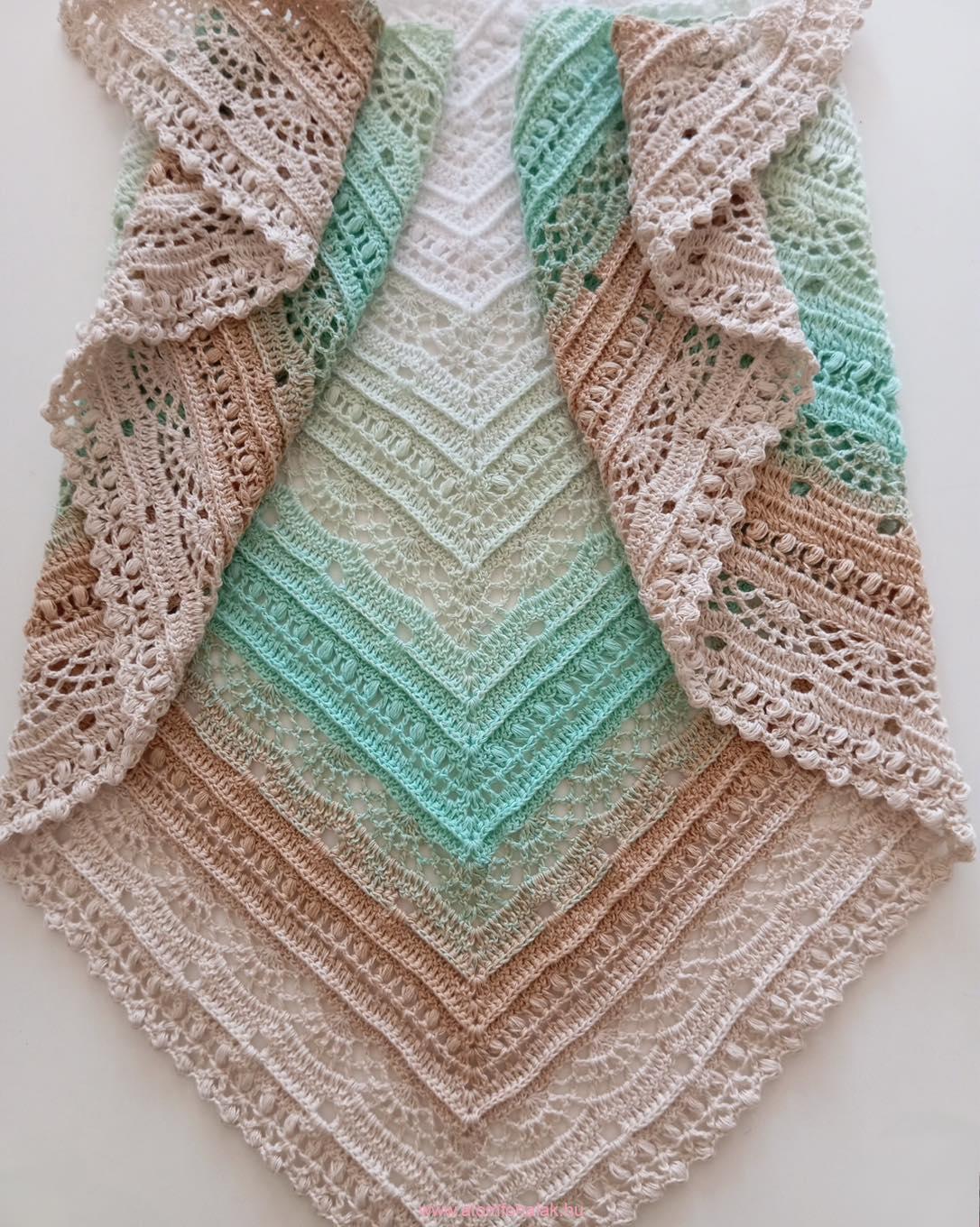 Így a kendő vége szép, egyenletes színátmenettel zárul, és az utolsó szín igazán kiemelkedik több soron keresztül is. Nincs szükség külön egyszínű gombolyag vásárlására – minden egyben megtalálható ebben a különkiadásban!